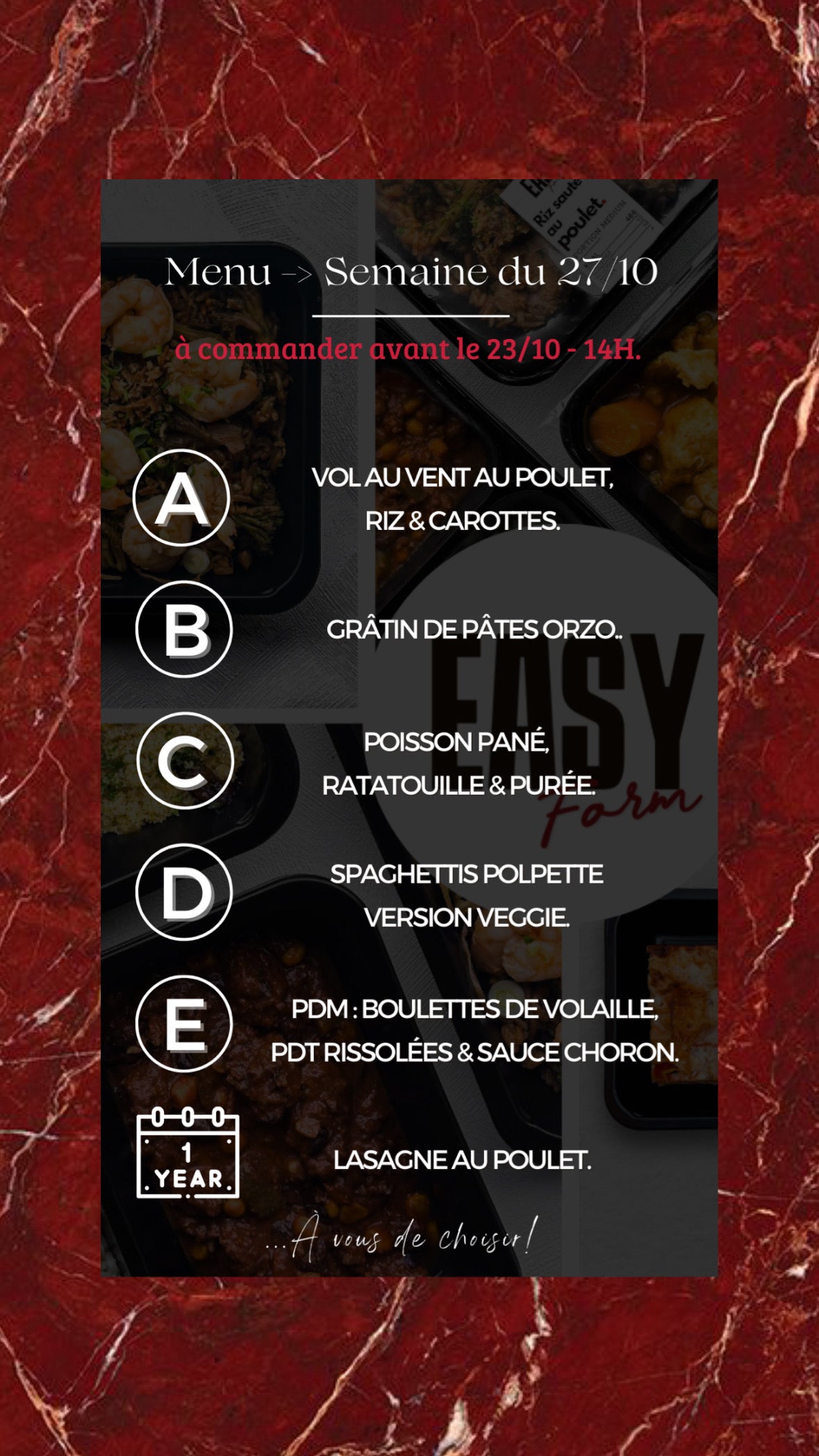 Les commandes pour la semaine prochaine doivent être passées Jeudi à 18h00 au plus tard.